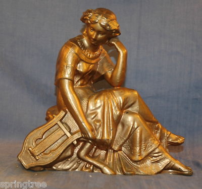 Antique Metal Clock Topper Figure Woman w/ Harp MUSIC