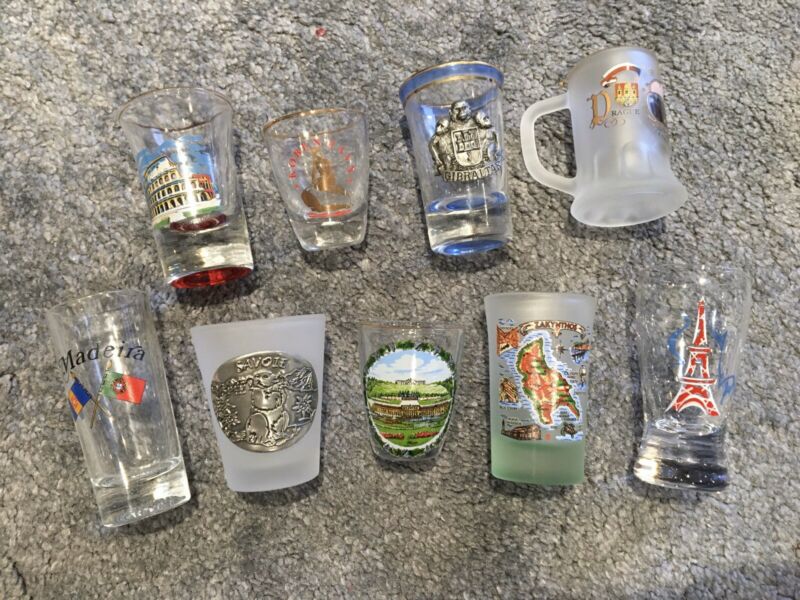 9 X Shot Glass Collection Europe France Portugal Gibraltar Italy Denmark