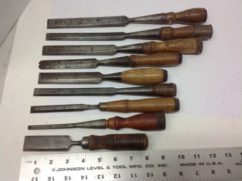 Title (ebay affiliate link): LOT OF 9 VINTAGE BEVEL EDGE CHISELS SEVERAL MAKERS 8 MARKED !!!!!