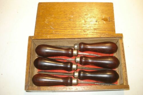 6 ANTIQUE MILLERS FALLS WOODCARVING CHISELS WITH ROSEWOOD HANDLES & CHESTNUT CAS