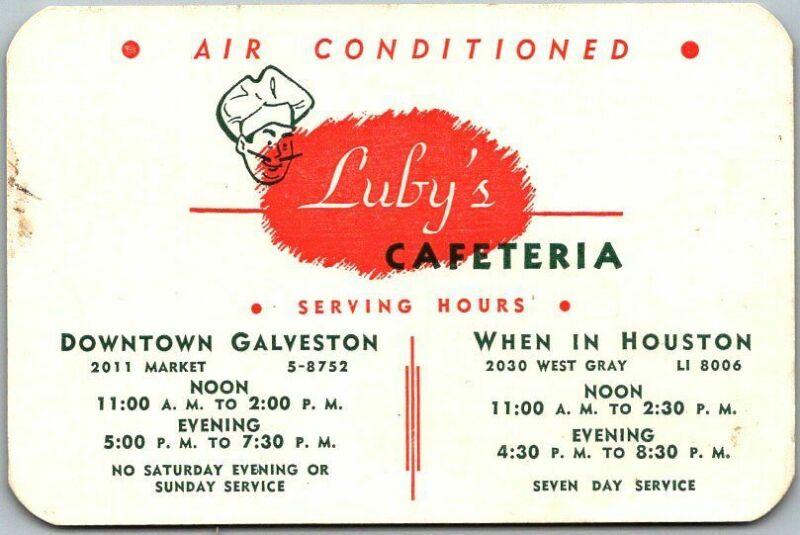 Title (ebay affiliate link): 1950s Galveston / Houston Texas Advertising Card LUBY''S CAFETERIA / Map on Back