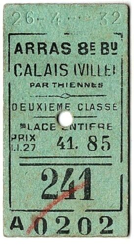Railway ticket: France: Arras to Calais Ville - 1932