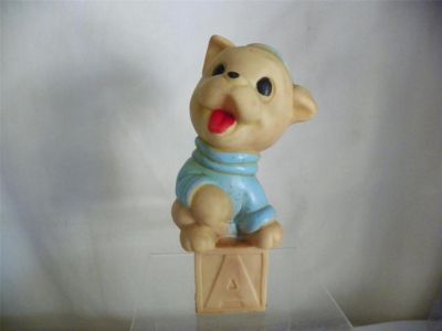 Vintage Rubber Squeak Toy Dog Sitting on Block 1950's