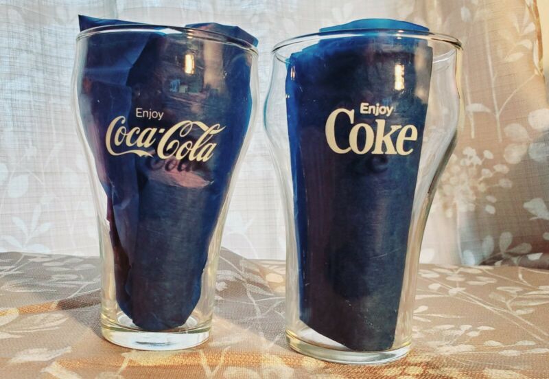 Title (ebay affiliate link): 2 Vintage 5" DRINK Coca-Cola ENJOY Coke Bell-Shaped Glass Tumblers 12 oz