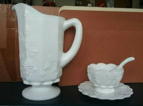 Signed lot 4 Westmoreland Milk Glass Paneled Grape Pitcher Mayo spoon dish plate