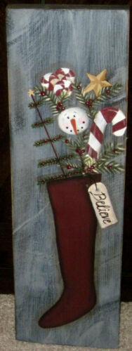 *~*PRIMITIVE*~*HP FOLK ART PRIM STOCKING * SNOWMAN * CANDY CANE * TREE *~* BOARD