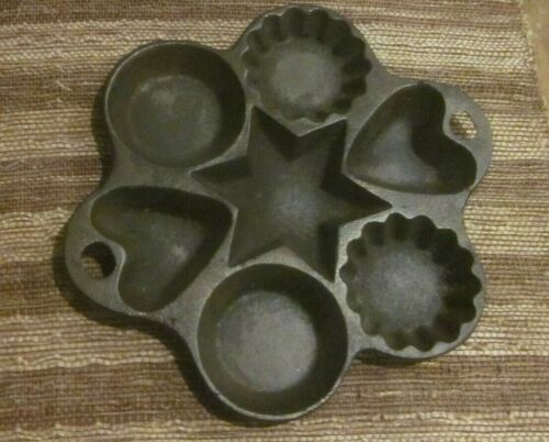 Title (ebay affiliate link): BEST Old 7 Muffin Hearts Star Form Cast Iron Mold Pan Patina Folky