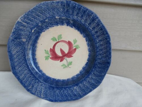 Title (ebay affiliate link): Rare Antique Primitive Spongeware Spatterware Red Flower Blue Dinner Plate1830s