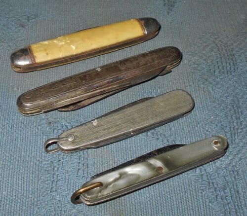 4 Antique Older Vintage Small Pocket Knives Fobs Coin Silver Fruit Pick...