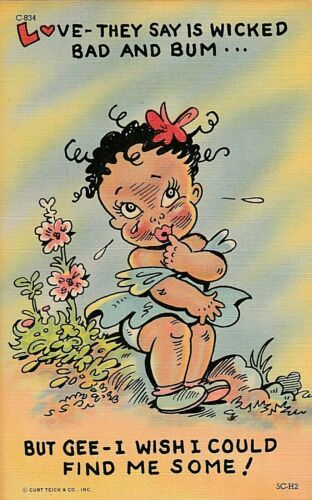 OLD LINEN BLACK AMERICANA POSTCARD " LOVE THEY SAY IS WICKED BAD AND BUM..."