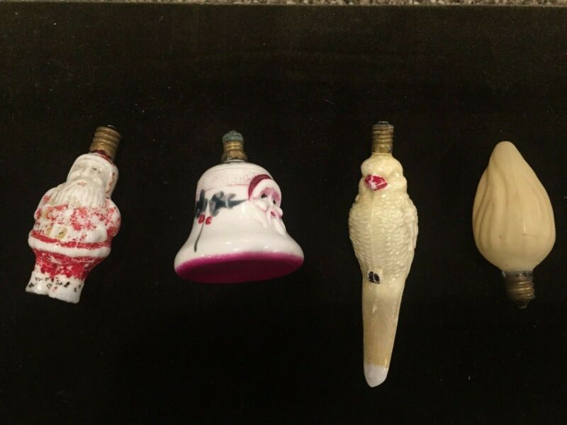 Four Vintage Figural Christmas Bulbs Milk Glass Santa, Santa Bell, Parrot, Flame