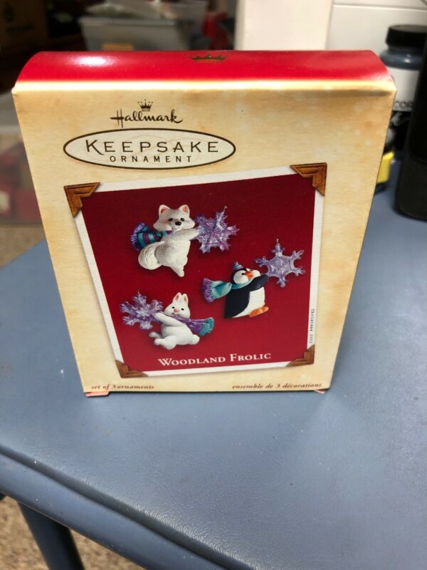 Title (ebay affiliate link): Hallmark Ornament 2002 WOODLAND FROLIC Set 3 Penguin Rabbit Fox Snowflakes Mini