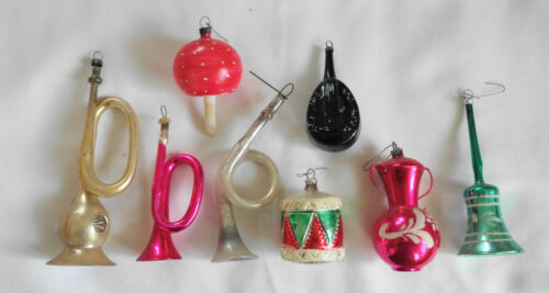 Title (ebay affiliate link): (8) Antique Christmas Tree Ornaments Glass Trumpets Drum Violin Mushroom...ect