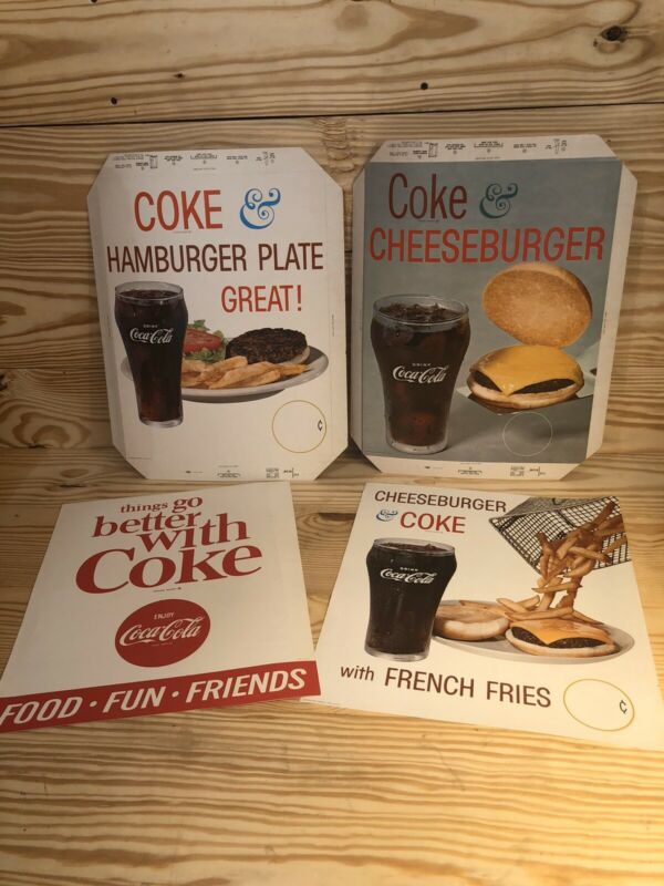 Title (ebay affiliate link): LOT VINTAGE Coca Cola Paper Menu Food Restaurant Signs LOT OF FOUR CHEESEBURGER