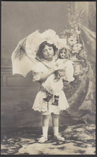 Edwardian young girl with her big bisque doll antique real photo postcard
