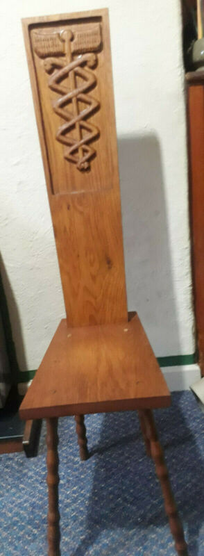 Title (ebay affiliate link): Vintage spinning stool.Carved back with staff of Hermes. 4 spindle legs
