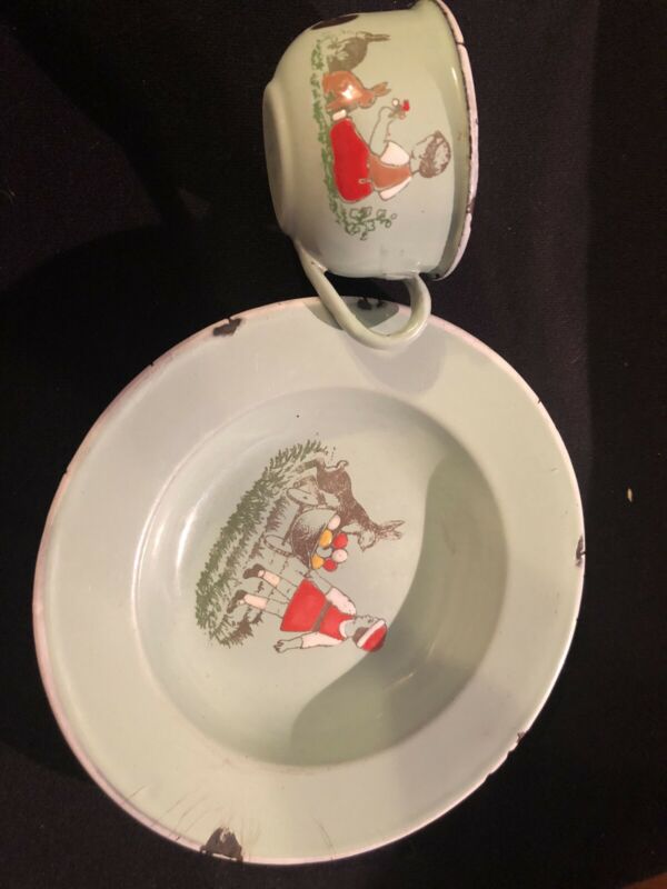 Antique, Germany Childs2-pc Enamelware Dutch Cup and Deep Dish-Plate Set