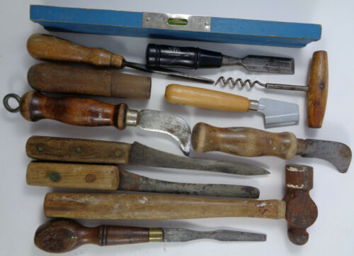 Title (ebay affiliate link): Lot of vintage tools with wooden handles: knives, corkscrew, hammer, chisel, etc