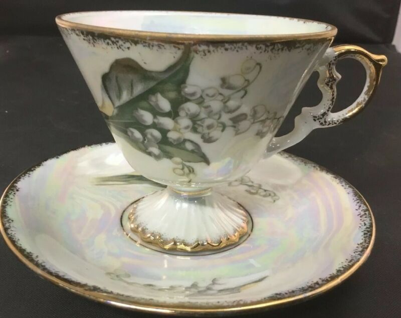 Vintage Ucagco Tea Cup & Saucer May Lily Of The Valley Lusterware Iridescent