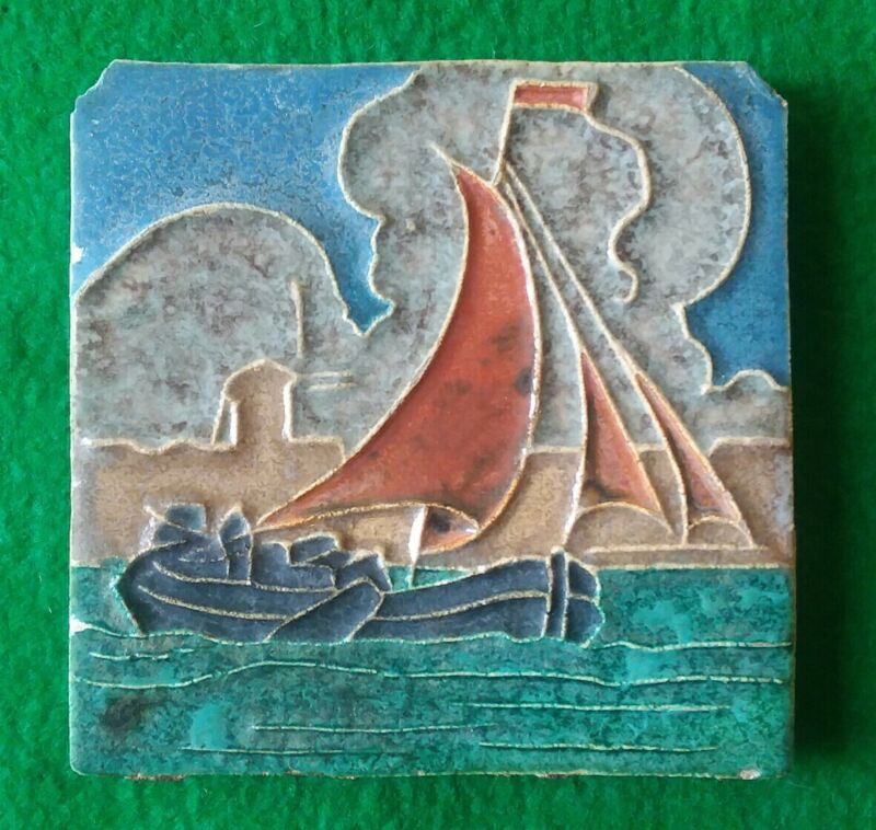 Title (ebay affiliate link): Vintage Early Hand Made Tile Nautical Maritime Sail Boat Seascape 4x4 Wall Decor