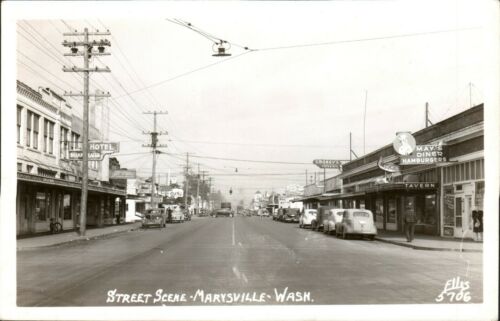 Vintage RPPC Postcard Marysville WA "Street Scene" May''s Diner-Hamburgers