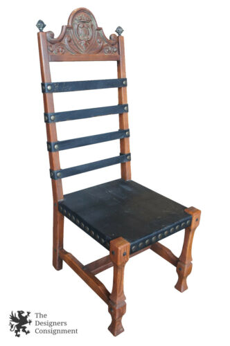 Old World Spanish Revival Carved Oak Chair Leather Seat Ladder Back Castle 50"