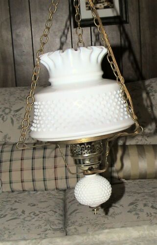 Vintage White Milk Glass Hobnail Hurricane Hanging Lamp Chandelier Working