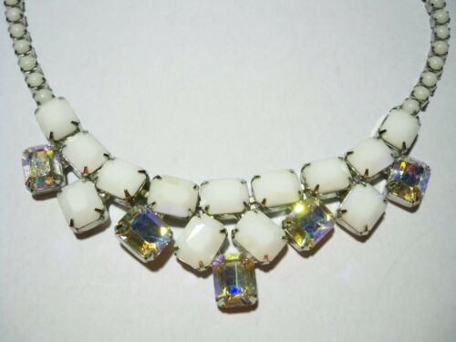 Vintage Prong Set White Milk Glass and Aurora Borealis AB Rinestone Necklace