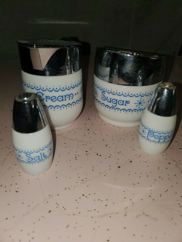Title (ebay affiliate link): GEMCO SNOWFLAKE BLUE Milk Glass White Creamer Cream Pitcher Sugar and salt and