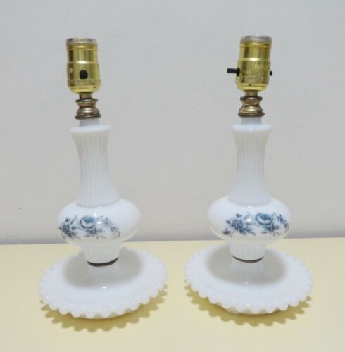 Title (ebay affiliate link): Pair Vtg White Milk Glass Candlewick Table Boudoir Lamps, Blue Floral, Working