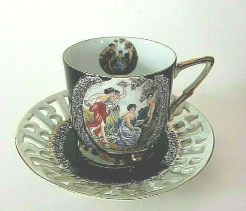 Vintage LM Royal Halsey Footed Maidens/Nude Black Tea Cup & Latice Edge Saucer