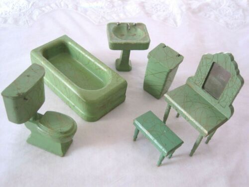 Vintage Strombecker Dollhouse Furniture Green Gold Drizzle Wood Bathroom Vanity