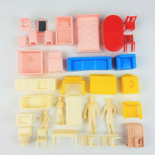 Vintage SUPERIOR PLASTIC DOLLHOUSE FURNITURE 30 pc LOT Family Bathroom TV vanity