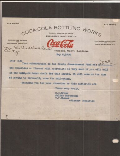 Title (ebay affiliate link): Tarboro, N. C. 1924 Coca Cola Bottling Works letterhead