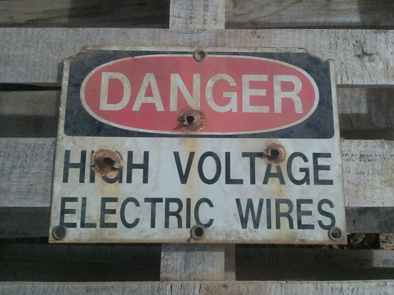 Title (ebay affiliate link): Old Porcelain DANGER HIGH VOLTAGE ELECTRIC WIRES sign with rusty bullet holes.