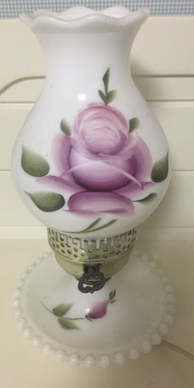 Title (ebay affiliate link): Antique White MILK GLASS Lamp Pink Roses Hurricane Flower Electric Scalloped