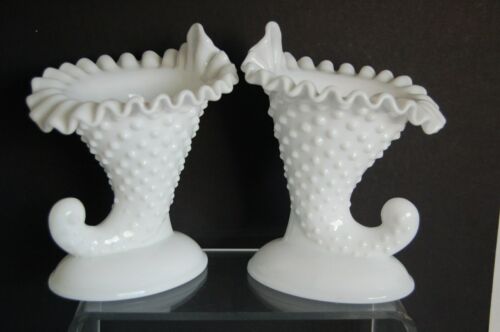 Pair of Vintage Fenton Hobnail White Milk Glass Cornucopia Candle Stick Holders