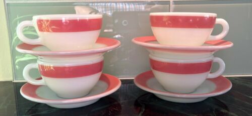 Set of 4 PYREX/CORNING MILK GLASS w/ Pink Band Trim Cups and Saucers