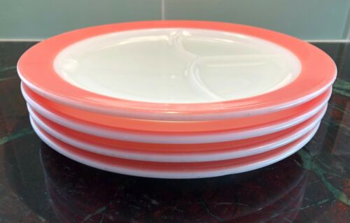 Title (ebay affiliate link): Vtg.Set of 4 Pyrex/Corning Milk Glass w/ Pink Band Trim Dinner Plates 1950 60''s