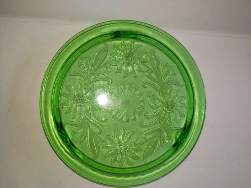 Vintage Jeannette Green Depression Glass Sunflower Design Footed Cake Plate
