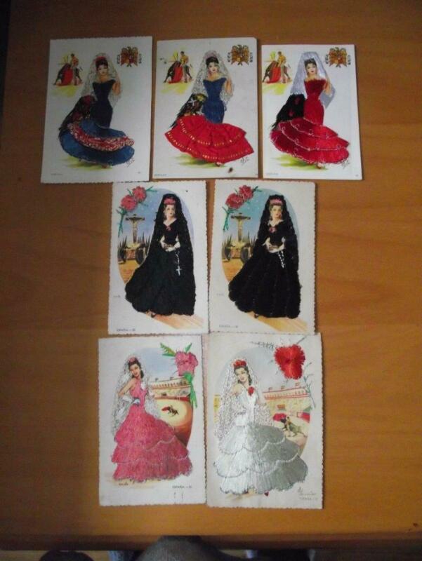 7 X EMBROIDERED SILK POSTCARDS SPANISH LADY SOME DUPLICATION SEE DESCRIPTION