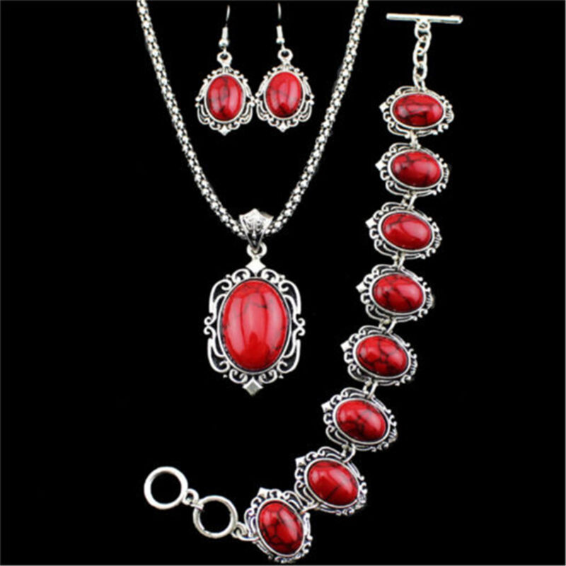 Elegant Antique Silver Plated Turquoise Necklace Bracelet Earring Jewelry Set