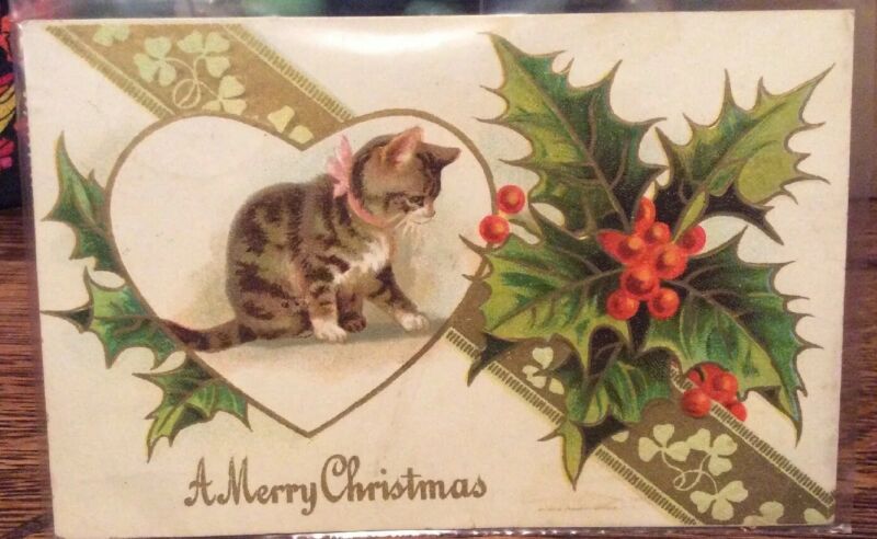 Title (ebay affiliate link): Antique Postcard Merry Greeting Victorian Christmas Cat Kitten Mistletoe