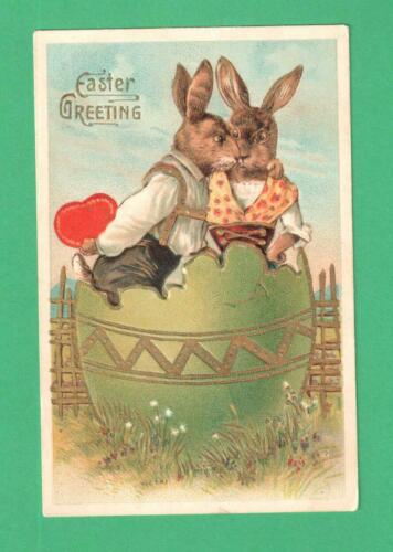 VINTAGE EASTER FANTASY POSTCARD RABBIT COUPLE KISSING DECORATED EGG-SHELL HEART