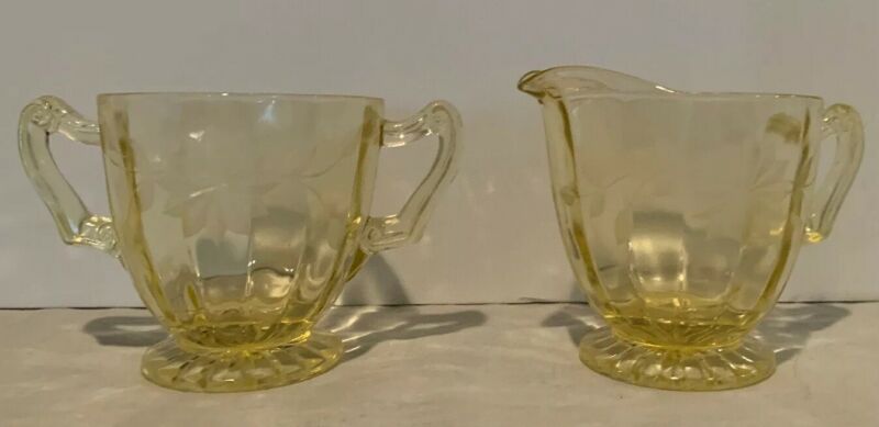 Title (ebay affiliate link): Vintage Yellow Depression Glass Creamer Open Sugar Bowl Etched Flowers