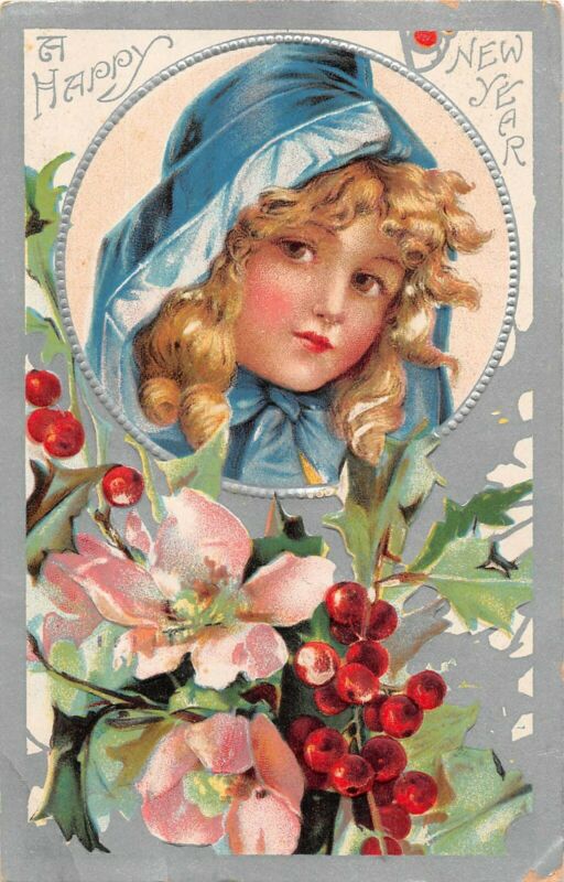 Title (ebay affiliate link): Beautiful Little Girl in Blue Hood-Holly & Winter Roses-Brundage-1909 New Year P