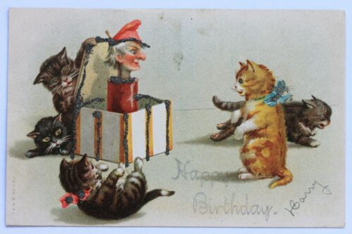 Title (ebay affiliate link): Old UDB glittered postcard CATS KITTENS & JACK-IN-THE-BOX, pre 1907