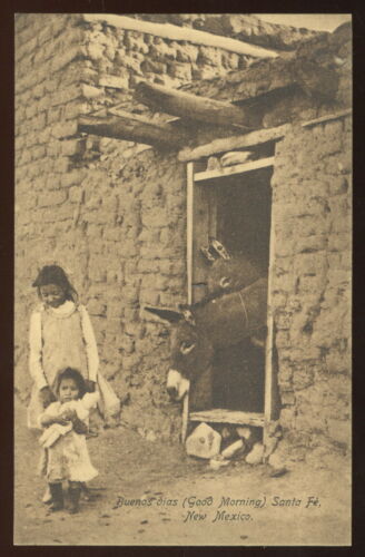 EARLY SEPIA PHOTO PC, BUENOS DIOS, SANTA FE, N.M. MULES & KIDS WITH DOLL