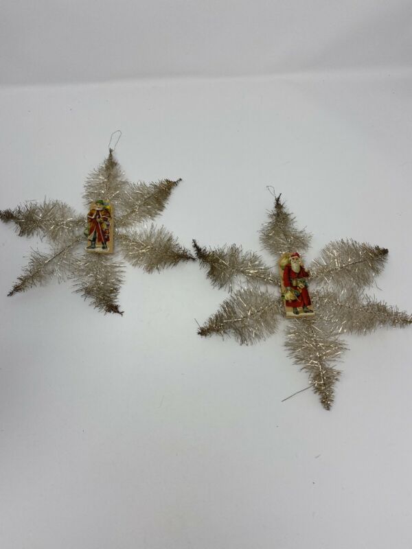 Title (ebay affiliate link): 2 Victorian Feather Tree Snowflake German Tinsel Ornaments Red Robe Santa Scrap