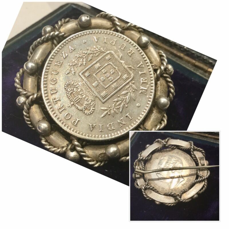 Title (ebay affiliate link): Antique Jewellery Rare Silver 1818 Portuguese India Rupee Coin Brooch Pin